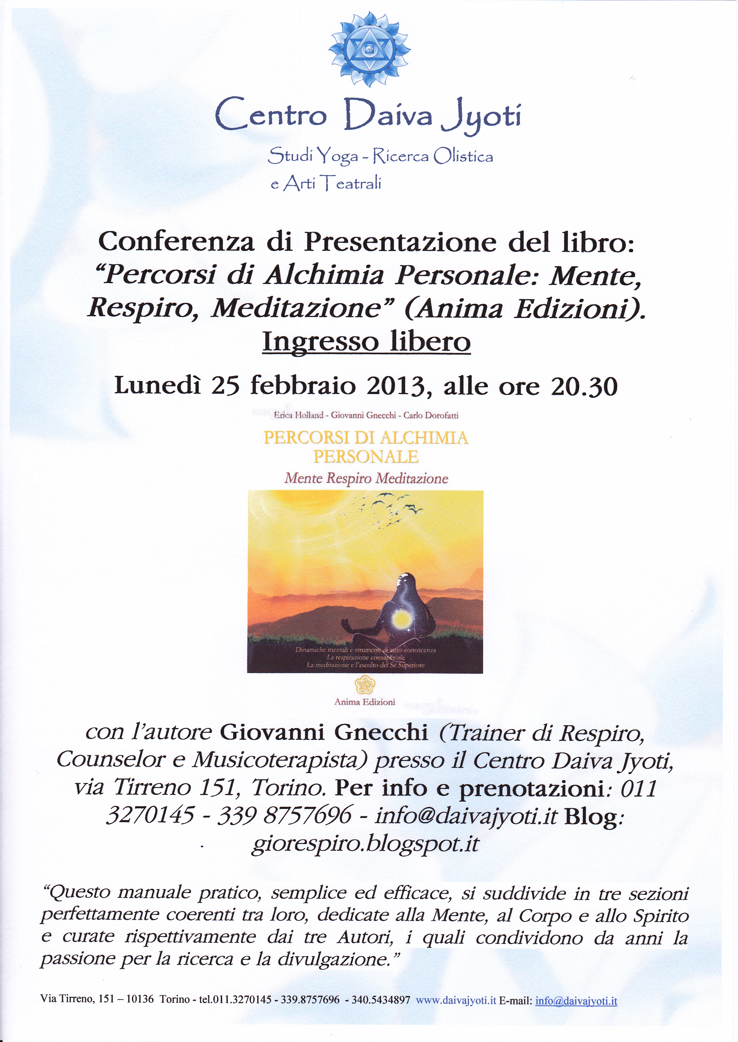 Lunedì 25 febbraio alle ore 20.30, l’autore Giovanni Gnecchi (Trainer di Respiro, Counselor e Musicoterapista) presenta il libro “Percorsi di Alchimia Personale: Mente, Respiro Meditazione”.