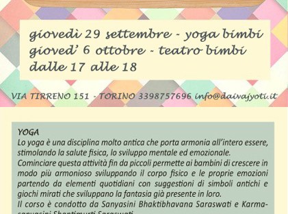 Bambini!! Stavate aspettando l’attività speciale per i pomeriggi autunnali?? Eccola… il Centro Daiva Jyoti propone un corso di yoga e teatro tra i 4 e i 10 anni. Potete venire a provare il 29 settembre ed il 6 ottobre dalle ore 17.00 alle 18.00 in via Tirreno 151 – Torino. Per informazioni 3398757696.