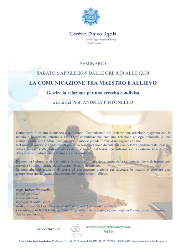 Il corso ha l’obiettivo di trasmettere le nozioni di base delle teorie della comunicazione e di trasmettere metodi e strumenti pratici da utilizzare nel ruolo di maestro.