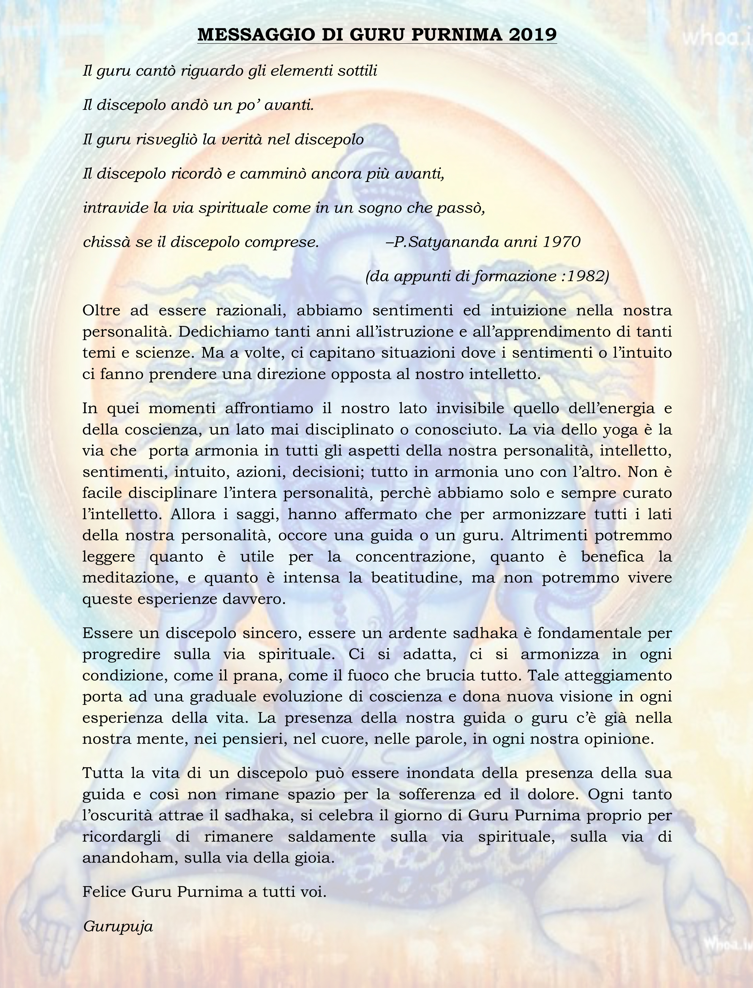 Il 16 luglio 2019 si celebra Guru Purnima, nella notte di luna piena, in cui si rende gratitudine a tutti i Maestri e si rinforza la pratica personale.