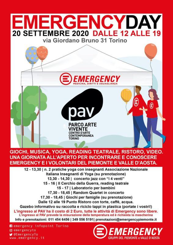 Partecipiamo con una pratica yoga (su appuntamento) come insegnanti dell’ASSOCIAZIONE NAZIONALE ITALIANA INSEGNANTI YOGA – YANI all’evento EMERGENCY DAY al PAV Parco Arte Vivente – Centro D’Arte Contemporanea Torino domenica 20 settembre 2020 dalle 12 alle 19 in Via Giordano Bruno 31, Torino