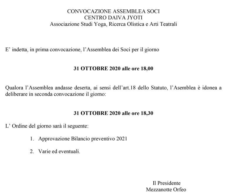 L’assemblea si svolgerà on line, è necessaria la prenotazione scrivendo a info@daivajyoti.it entro il 30 ottobre 2020