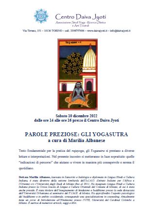 Testo fondamentale per la pratica del rajayoga, gli Yogasutra si prestano a diverse letture e interpretazioni. Nel presente incontro si metteranno in luce soprattutto quelle “indicazioni di percorso” che aiutano a vivere in maniera più consapevole e serena il quotidiano.