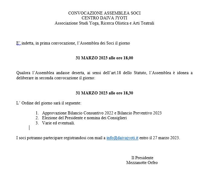 UncategorizedAssemblea Soci Centro Daiva Jyoti 17/03/2023 Bhaktibhavana Saraswati In seconda convocazione Venerdì 31 marzo 2023 ore 18,30 Condividi: Fai clic per condividere su X (Si apre in una nuova finestra) X Fai clic per condividere su Facebook (Si apre in una nuova finestra) Facebook Altro Fai clic qui per stampare (Si apre in una nuova finestra) Stampa Fai clic per condividere su WhatsApp (Si apre in una nuova finestra) WhatsApp Fai clic per inviare un link a un amico via e-mail (Si apre in una nuova finestra) E-mail Mi piace Caricamento... Correlati